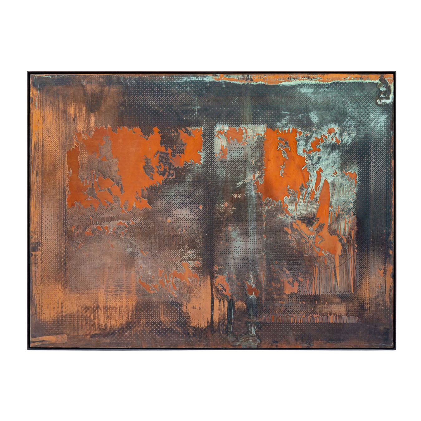 Etched and inked copper with verdigris patina
