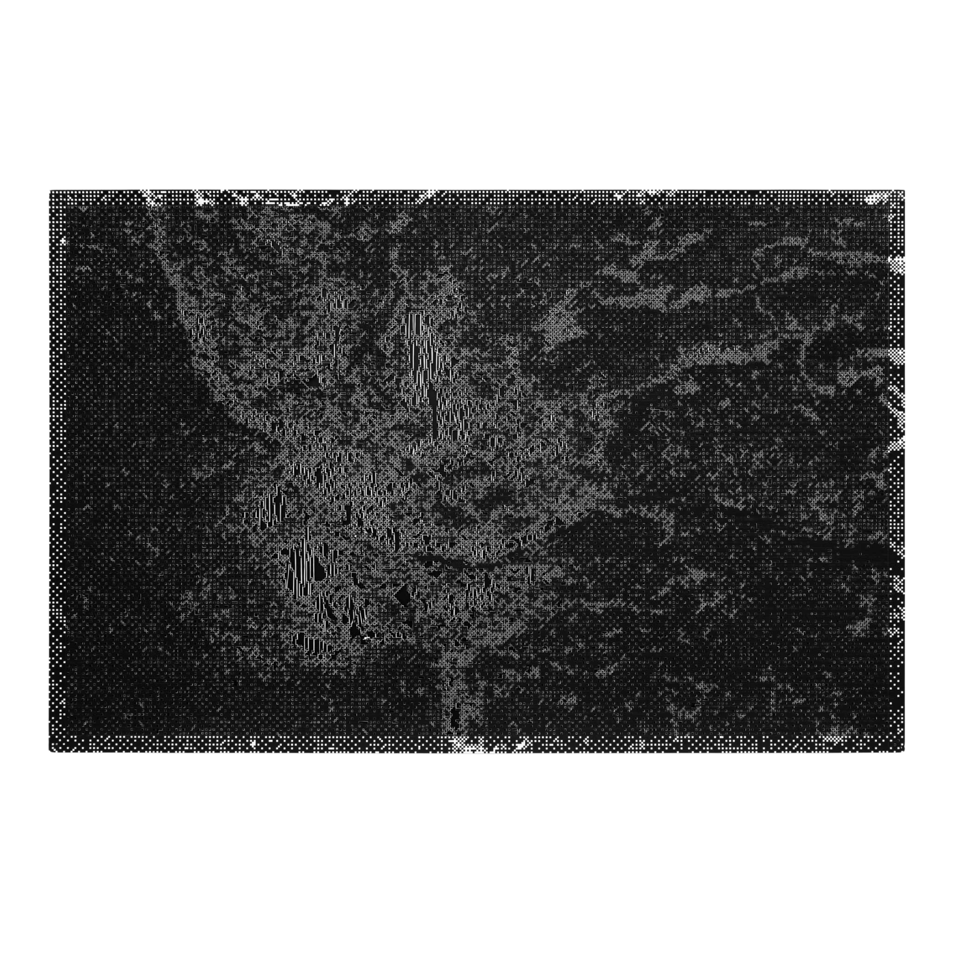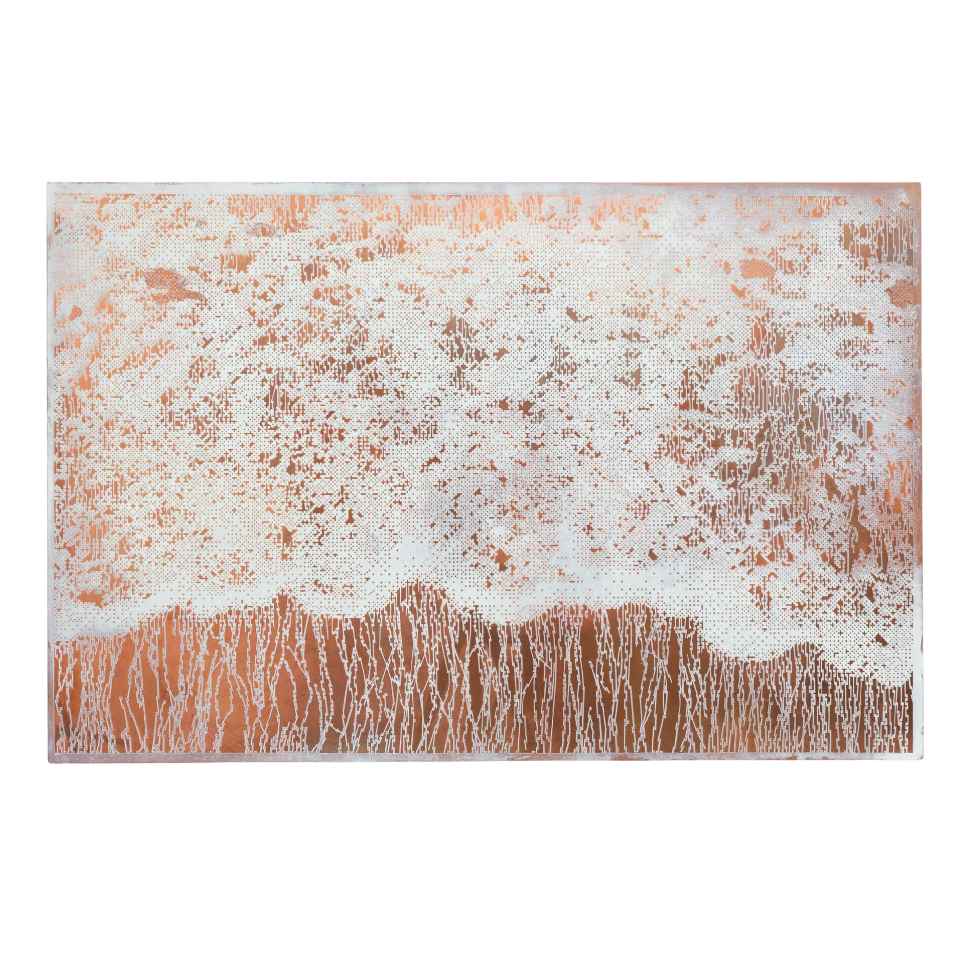 The series Neither Nor (2023–25), depicts dynamic tides and horizonless unfurling clouds, reflecting on the infinite universe. The water and waves speak to the essential physical and digital connections of lands through oceans, and people via networks of media. To make this body of work, Harris’ photographs were translated into binary prints then cut from woodgrain-stained papers, which echo the motifs. The residual stencils were used as works in themselves (Time & Change), to make rubbings (Impressions (Rhythm & Motion)) – and photo-etched copper (Hard Copy (Always & Already)), which record the declining matrixes in metal before destroying them completely. In the gallery space, the unframed works delicately enhance materiality. Cloudscapes are suspended overhead and the shorelines on the horizontal planes, responding to atmospheric conditions.